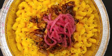 cavatappi pasta, cheddar cheese sauce, pulled pork BBQ sauce, cheddar jack & pickled red onions. Served with a side of OBX sauce.